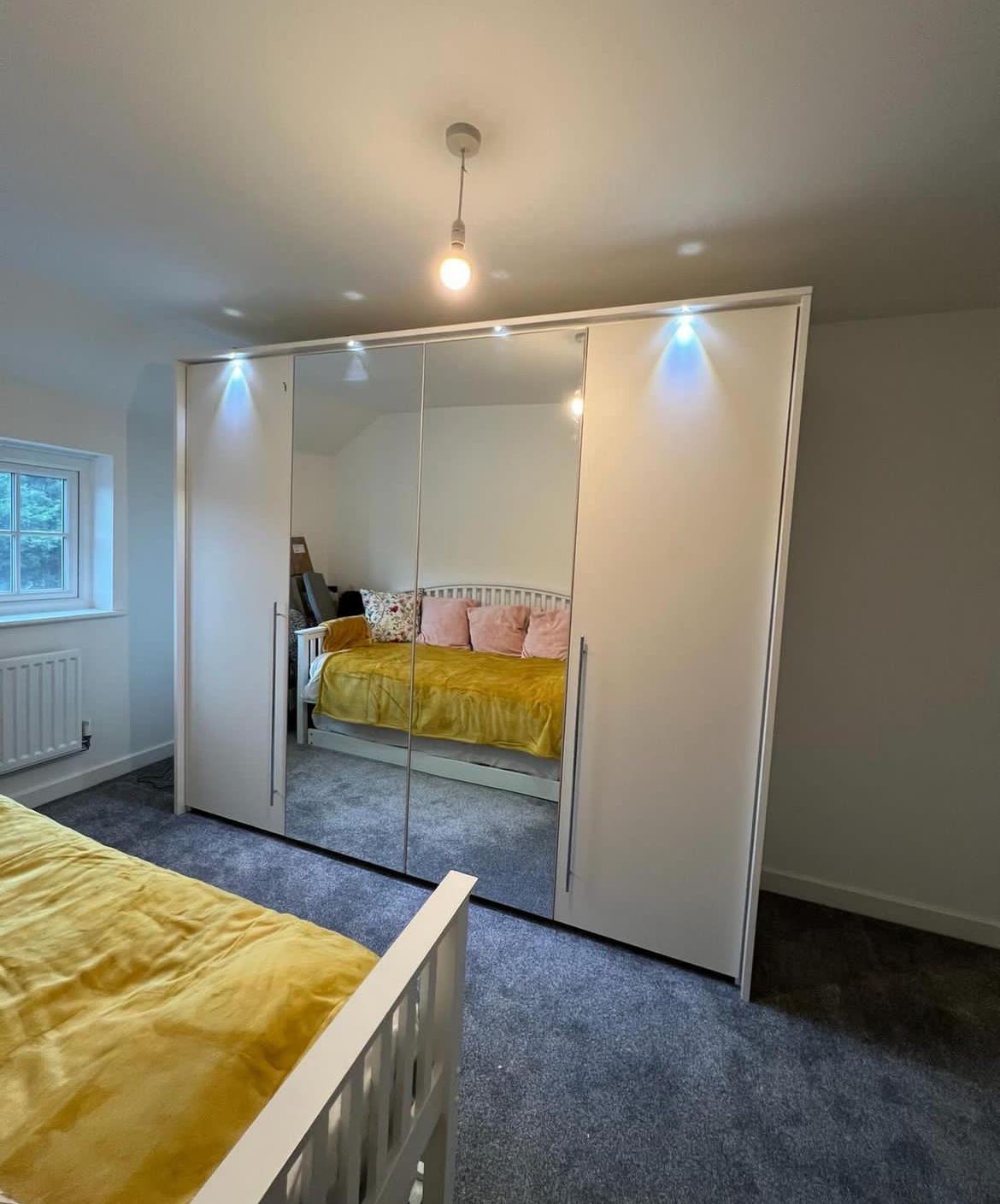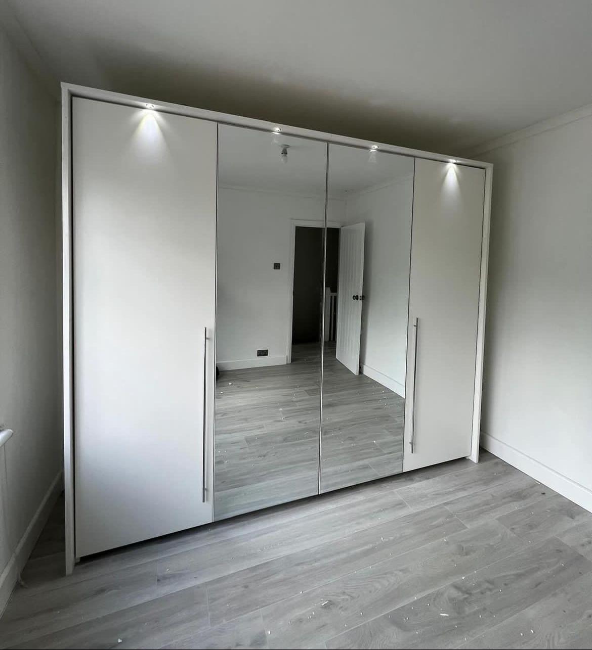 For example, if your wardrobe is 250 cm wide and 215 cm high, please provide us with a floor space of 270–280 cm by 235-245 cm on the floor to carry out the assembly before it can be lifted into its free-standing position. This allows the wardrobe to be built on the floor with sufficient space to work around it to fit any fixings and panels before lifting it onto its base.
